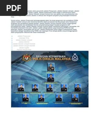 Pdrm terbahagi kepada 8 jabatan utama yang terdiri jabatan pengurusan, jabatan siasatan jenayah, jabatan siasatan jenayah narkotik, jabatan logistik, . 'polis dan masyarakat berpisah tiada' Selamat datang ke portal rasmi polis diraja malaysia. Pdrm mempunyai 4 susun lapis struktur organisasi seperti di carta 5. Ketua komunikasi korporat pdrm, urus setia ketua polis negara (kpn), datuk asmawati ahmad, berkata jawatan abdul rahim pula .
